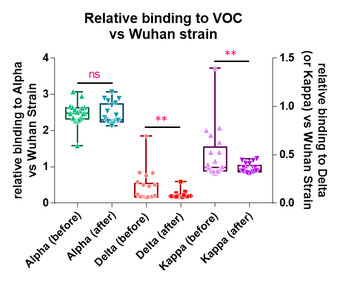 También se ha comparado la producción de los anticuerpos contra la variante de Wuhan y la reactividad de esos mismos anticuerpos contra tres de las variantes preocupantes del virus SARS – CoV – 2 ( Alpha, Delta y Kappa)