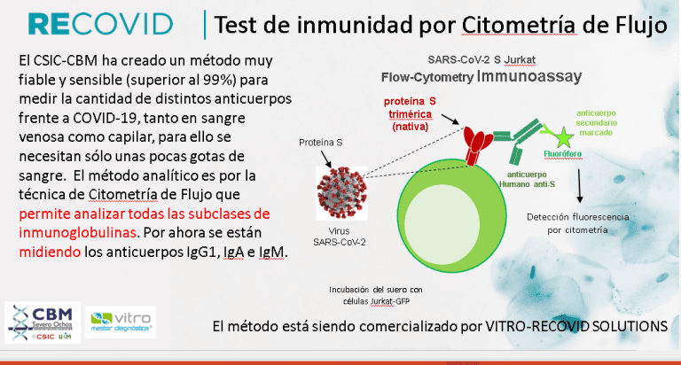 Todos los datos del estudio han sido obtenidos gracias al test , desarrollado por el equipo de Alarcón, y comercializado por la empresa Recovid Solutions (grupo Vitro S.A), que, en palabras de este investigador del CSIC « se basa exclusivamente en la proteína S pero con la diferencia, en comparación con los métodos basados en ELISA o C LIP, de que la proteína S en nuestro sistema es la nativa, en forma trimérica, completamente funcional y, por lo tanto, es capaz de detectar anticuerpos contra la forma natural de S que los métodos basados en proteínas recombinantes no ven».