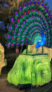 Brilla Zoo es un recorrido iluminado formado por esculturas de animales gigantes, efectos visuales y sonido ambiental que envuelven el entorno natural de los lagos del parque. Las figuras, inspiradas en animales de todo el mundo —desde mamíferos hasta aves exóticas— están repartidas en varias zonas temáticas que hacen que pasear por el parque sea como adentrarse en un zoológico de luz.