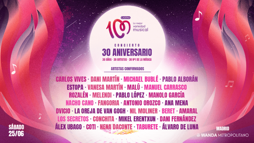 Cuatro horas de buena música y sorpresas durante un evento que reunirá en un mismo lugar a los oyentes y a esos artistas que han puesto letra y música a estas tres últimas décadas. De este modo, y a lo largo de estos meses, CADENA 100 ha ido confirmando el resto de nombres: Vanesa Martín, Pablo López, Melendi, Pablo Alborán, Malú, Nacho Cano, Manuel Carrasco, Dani Martín, La Oreja de Van Gogh, Fangoria, Amaral, Beret, Manolo García, Rozalén, Álvaro de Luna, Nil Moliner, Ana Mena, Estopa, Carlos Vives, Mikel Erentxun, Álex Ubago, Nena Daconte, Dvicio, Antonio Orozco, Los Secretos, Coti, Dani Fernández, y Taburete que junto con el anuncio de Conchita esta misma mañana, componen el cartel de los 30 “números 1” de la música. La cantante, imprescindible en la historia de la emisora y creadora de ‘El Viaje’, no podía faltar en una noche en la que celebraremos las tres décadas en antena de CADENA 100.