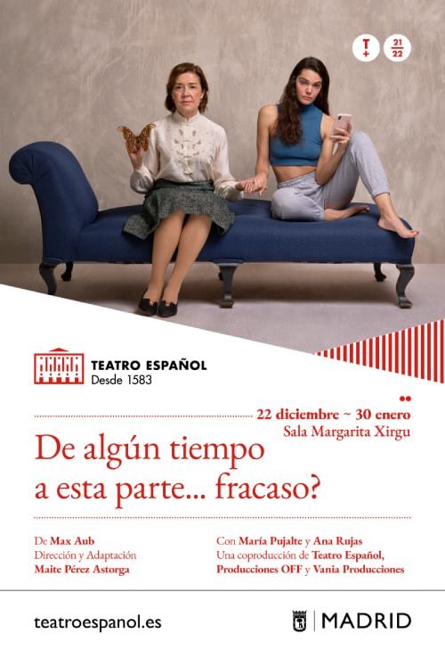 La Sala Margarita Xirgu del Teatro Español, espacio del Área de Cultura, Turismo y Deporte del Ayuntamiento de Madrid, presenta el 22 de diciembre el estreno de De algún tiempo a esta parte… Fracaso?, espectáculo adaptado y dirigido por Maite Pérez Astorga a partir del texto de Max Aub. La obra, que estará en cartel hasta el 30 de enero, parte del estremecedor monólogo que Max Aub escribió en 1939 en los primeros meses de su exilio republicano en París, y está protagonizada por María Pujalte y Ana Rujas.