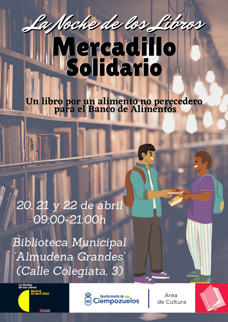 Entre los días 20 y 22 de abril, Ciempozuelos, con el objetivo de sumarse a la conmemoración del Día del Libro, realizará un mercadillo solidario. Los ciudadanos pueden participar aportando algo de ayuda y, a cambio, recibirán un libro de regalo.