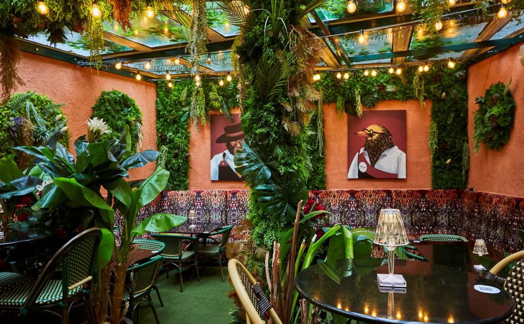 Recientemente han inaugurado la nueva zona garden, ideal para disfrutar de un cóctel y picoteo cuando llegue el buen tiempo. También es perfecto para los días lluviosos de primavera porque está cubierta, y es muy acogedora con toda su vegetación tropical y divertida decoración, con animal print por todos lados y unas obras de arte que representan el staff deformado y esperpéntico.