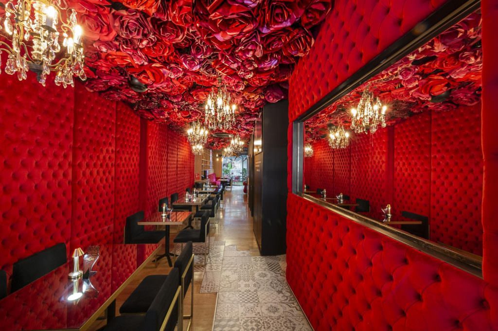 En la entrada de La Mejor Coctelería de Restaurante (Premios FIBAR 2021), nos encontramos en un mundo esperpéntico, con un techo repleto de las flores fetiche de Ramón María del Valle-Inclán y unas paredes aterciopeladas rojo pasión.