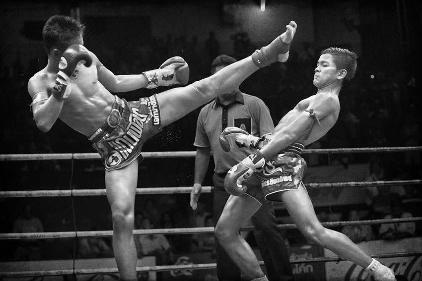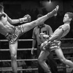 Aquí nos convertiremos en espectadores a través de fotografías de la práctica del Muay Thai, que recibe el nombre del arte de las ocho armas por utilizar las extremidades del cuerpo: manos, codos, rodillas y pies.