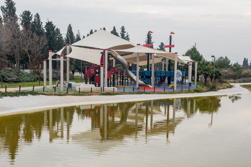 Este parque tiene dos características y es que no solo cuenta con la correspondiente zona infantil y de juegos sino también con un gran lago. En la zona infantil, los niños podrán disfrutar al máximo gracias al suelo de caucho y las zonas techadas, y cuenta con dos grandes estructuras de juego, un barco con grandes toboganes y un faro del que cae un tobogán metálico, además, ambas estructuras unidas por una pasarela.