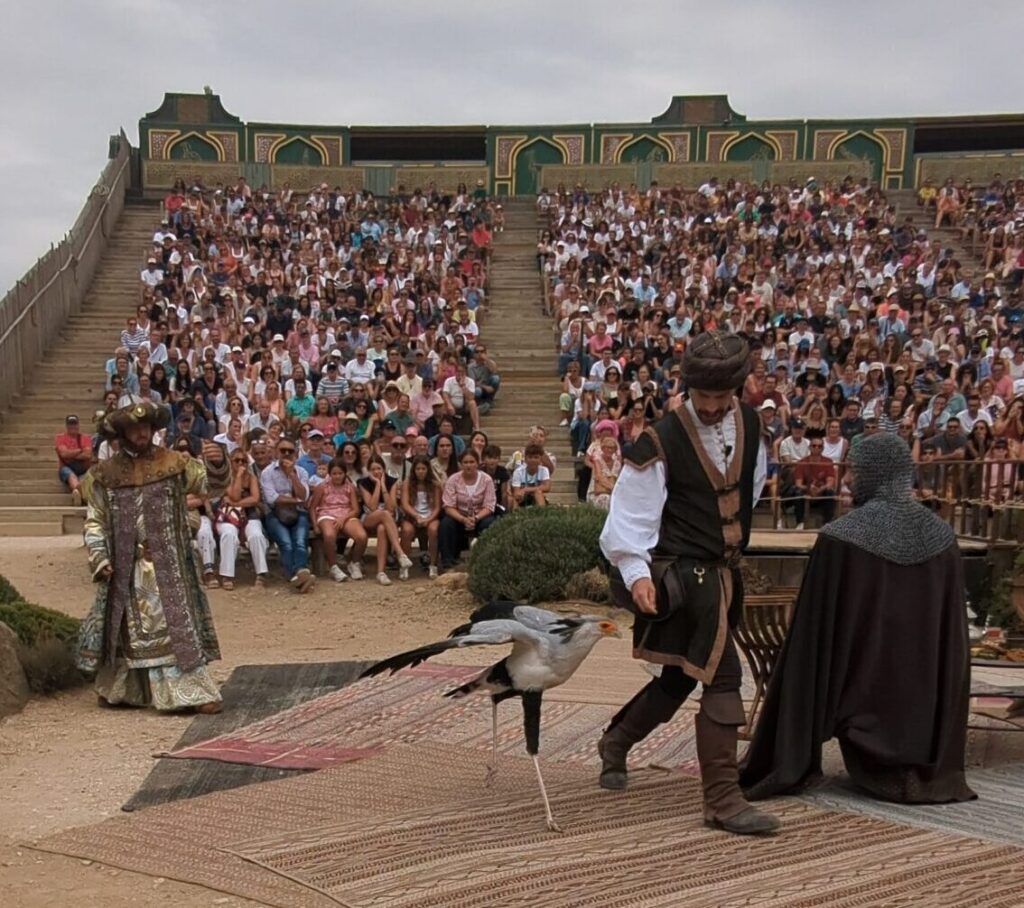 Un espectáculo de temática histórica centrado en la cetrería. Ante el público el Conde Fernán González de Castilla que viene de embajada, para aceptar la tregua y regalar al Califa un águila real en señal de paz. En respuesta, el califa cetrero le enseña sus azores. Comienza entonces una justa sin armas, duelo de esplendores volantes donde se encuentran dos tradiciones de cetrería: la gran cetrería de alto vuelo de los califas árabes y la cetrería Romano-Visigoda que practican los príncipes cristianos. Durante 30 minutos surcarán el cuelo halcones, búhos, águilas, milanos negros, cárabos, cigüeñas, grullas etc. No te pierdas el atípico serpentario, un ave rapaz africana, que realiza un divertido baile con sus alargadas patas.