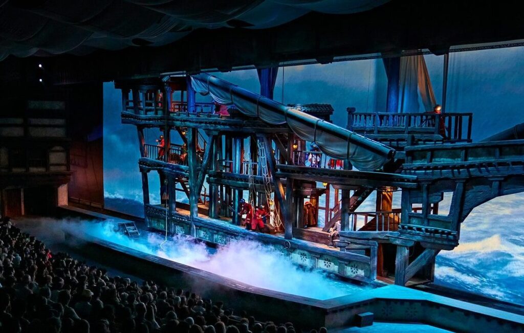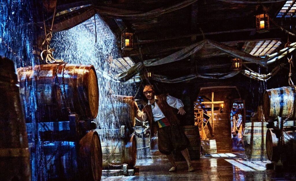 El espectáculo simula el vaivén del mar , las tempestades. Así, las paredes laterales del barco se mueven continuamente permitiendo divisar el mar y otras embarcaciones. De hecho, aunque el suelo no se desplaza, la sensación es de estar navegando e incluso puede llegar a sentirse cierta inestabilidad.