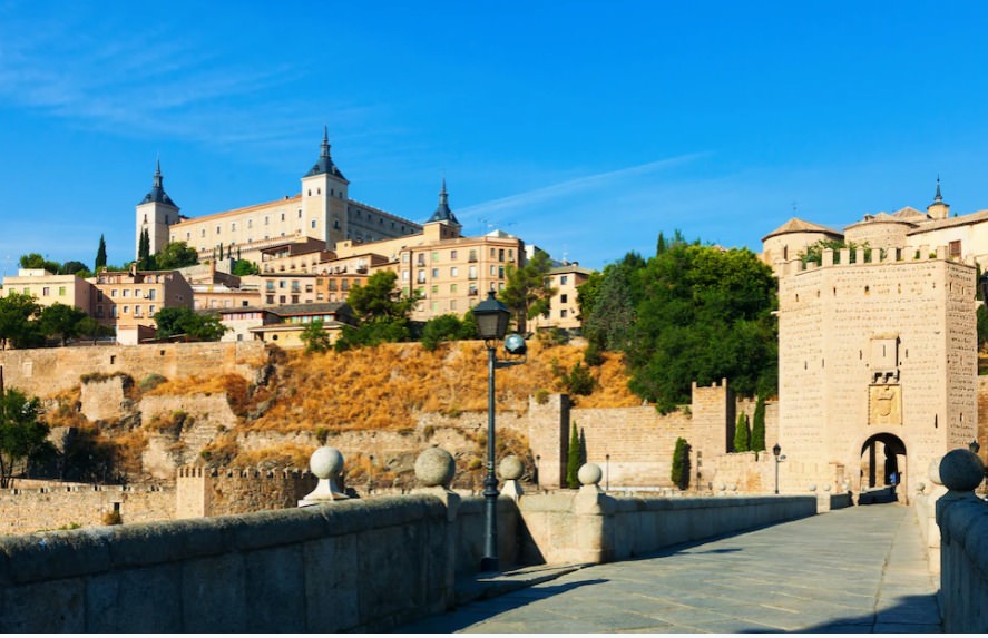 A una hora de Madrid, Toledo es un lugar que merece la pena visitar, sobre todo el casco antiguo y alrededores. La visita puede comenzar bordeando el casco histórico, que se encuentra amurallado, y al que se accede a través del Puente de Alcántara, que se eleva imponente sobre el río Tajo.