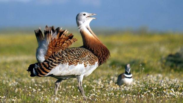Las aves más características de esta zona son las avutardas, donde decenas de machos se exhiben en la espectacular «rueda», qué esé cortejo que hacen los machos inflando sus sacos aéreos, erizando las plumas y alzando la cola en forma de abanico. Además dejan caer las alas para mostrar el color blanco de su plumaje.