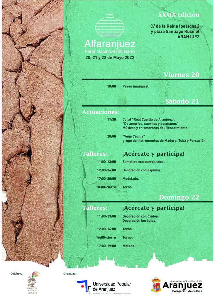 Este viernes 20 de mayo, a las 18,00 horas, dará comienzo la XXXIX edición de la Feria Nacional del Barro (Alfaranjuez 2022) y se prolongará hasta el domingo 22, en la zona peatonal de la calle de La Reina y la Plaza de Santiago Rusiñol.